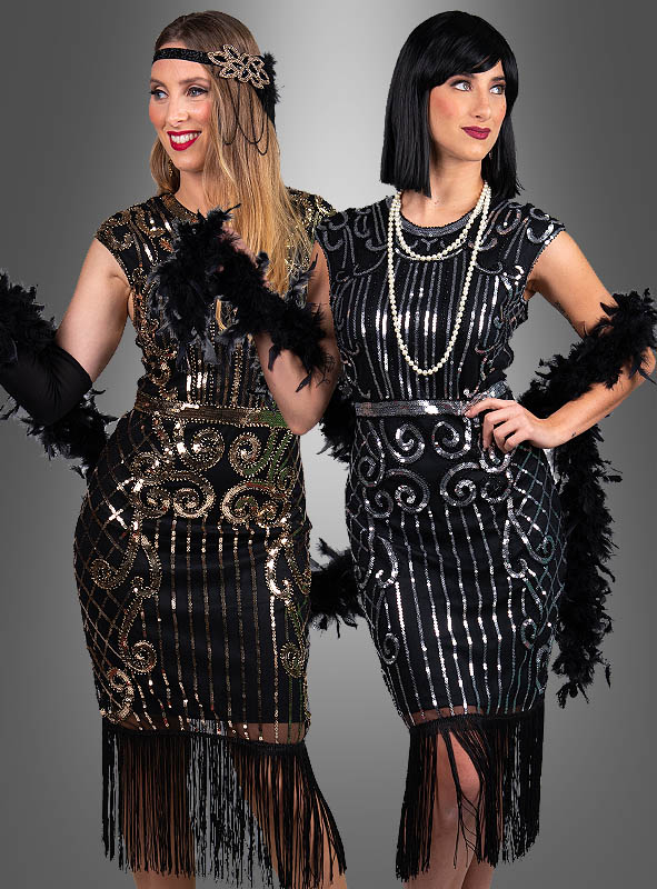 With us you can also find XXL 20s dresses. For example, this elegant cocktail dress Tatiana with sequins and accessories. With this evening dress in the Golden Twenties look, ladies who have a more voluptuous figure can finally shine. A wonderful costume for sophisticated events.Paillette dress plus size for 20s party